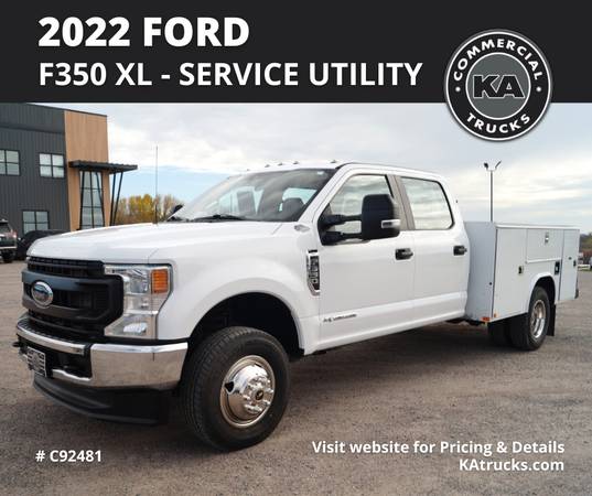 2024 Ford F350 XL - Service Utility Truck. 4WD. 7.3L V8. Gasoline. 10-Speed Automatic. 60" C/A. 179" WB. 4.30 Limited Slip Rear Axle Ratio. Engine Block Heater. Snow Plow Prep Package. Crew Cab. 6 Passenger. White Exterior. Medium Dark Slate Gray Vinyl Interior. Tow Hooks. Running Boards. DRW. 14,000 GVWR.