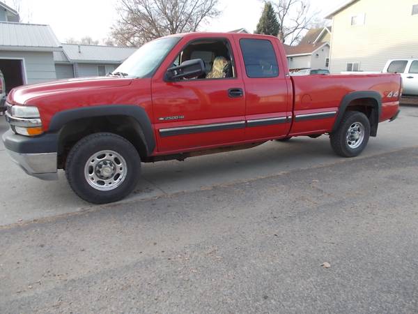 Selling this RUST FREE!!!! 2002 HD2500 4X4. Rare rust free truck with 8.1 Engine and Allison 5-speed. Runs smooth drives nice, NO lights lit up on dash cluster. NEW hyd. brake booster, brake switch, fresh oil/filter service, air filter, fuel filter, transmission filter fluid/flush service, spark plugs/wires, wiper blades and probably a few things i am forgetting. 2 year old battery and Kelly Edge A/T 10 ply tires with 85% tread remaining. All windows work as they should, no cracked glass. This is a Rust Free truck (see pics) that runs and drives nice with the rare 8.1 Big Block and Allison trans. 4.10 gear ratio with limited slip rearend. GVWR increased package. Serviced/tuned and Ready to drive/work. Has 231,000 miles, engine runs smooth and quiet and drives the same. Look how rust free the box is even under the fender flares VERY rare. Price is $10K Cash, if it doesn't sell I will be putting a used aluminum bed on it and the price will go up. Has turn over ball in the box as well as receiver hitch. Clear Title in hand, Located in Aberdeen, SD. CALLS ONLY (see pics), thx.