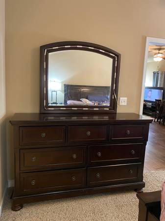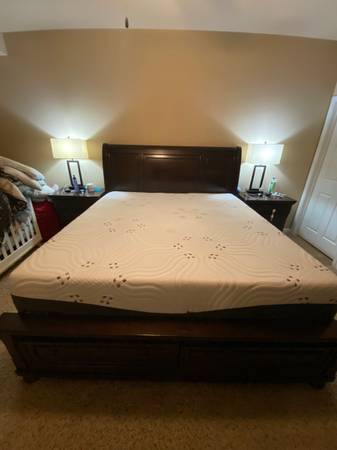 Sleigh bedroom set king size with mattress 14inch Bed frame ,2 night stands , one dresser with mirror