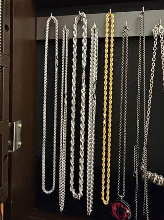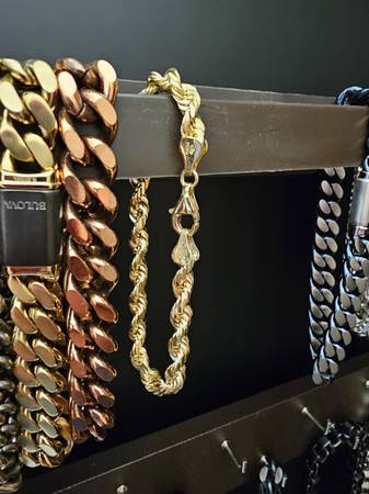 I have for sale a 10k solid gold rope chain. This is not gold plated or the hollow lightweight chain. This is a heavy solid 5mm gold rope chain. It retailed for about 3800 and I paid 2400. I've never worn it at all. I don't know why I bought it. I also have a 5mm 10k solid gold rope bracelet. New never used. It retailed for 1800 and I paid 1200 for it. I'd like 2200 for the necklace and 1000 for the bracelet. Best bet is to email me through the CL ad.